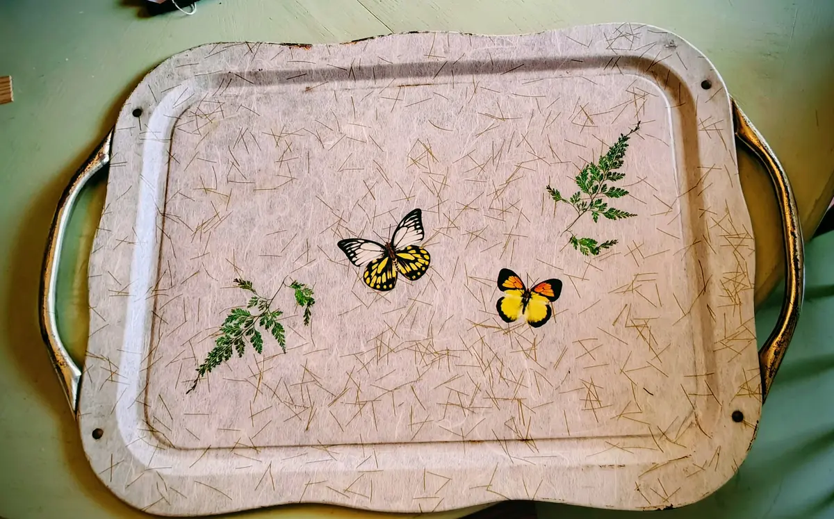 Large Vintage Metal Serving Tray with Buttferflies kw kw