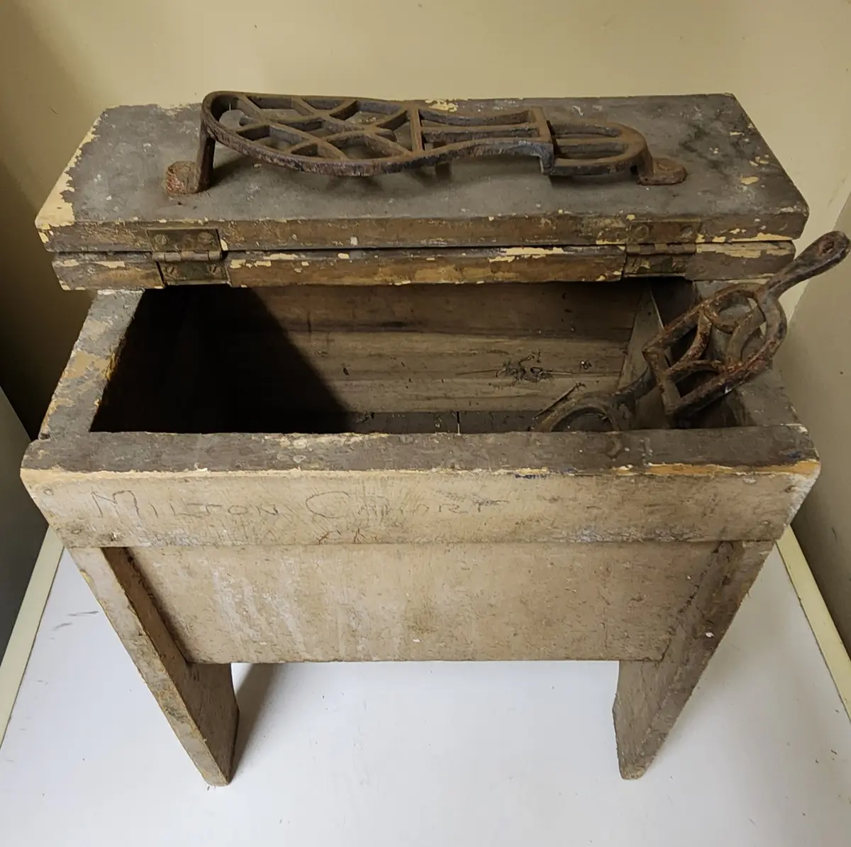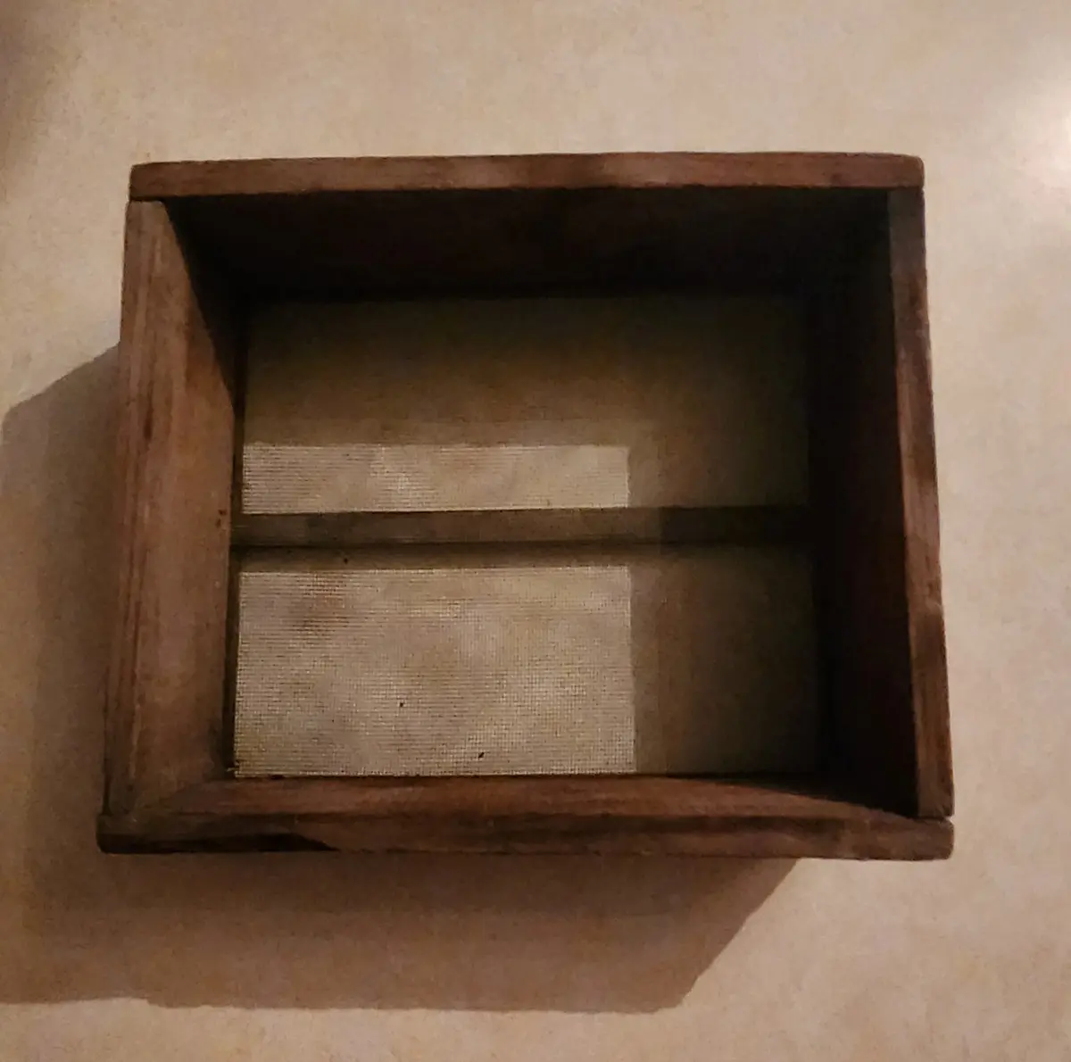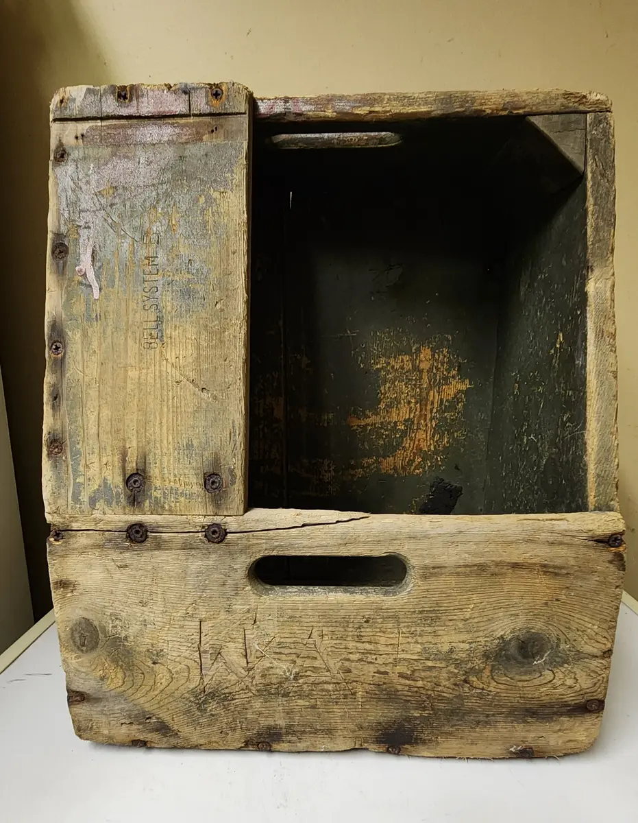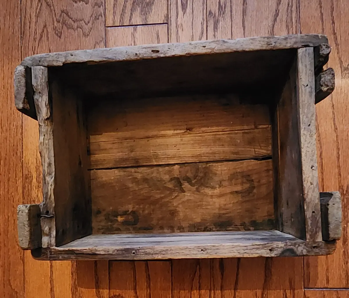 Unique wooden crate box, possibly a feed box, chicken nest, storage for potatoes?