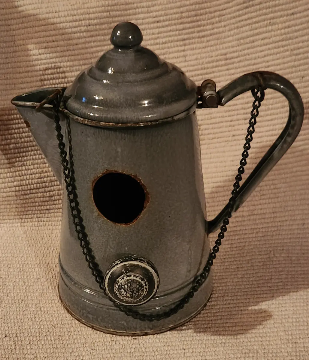 Graniteware coffee pot birdhouse