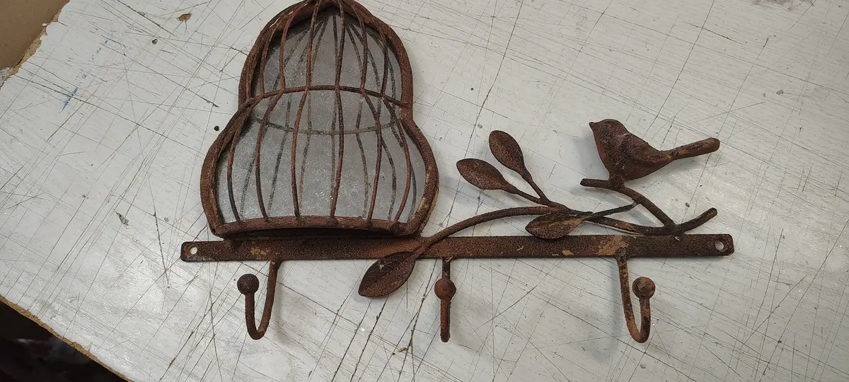 Rustic Cast Iron Bird and cage with Hooks kw
