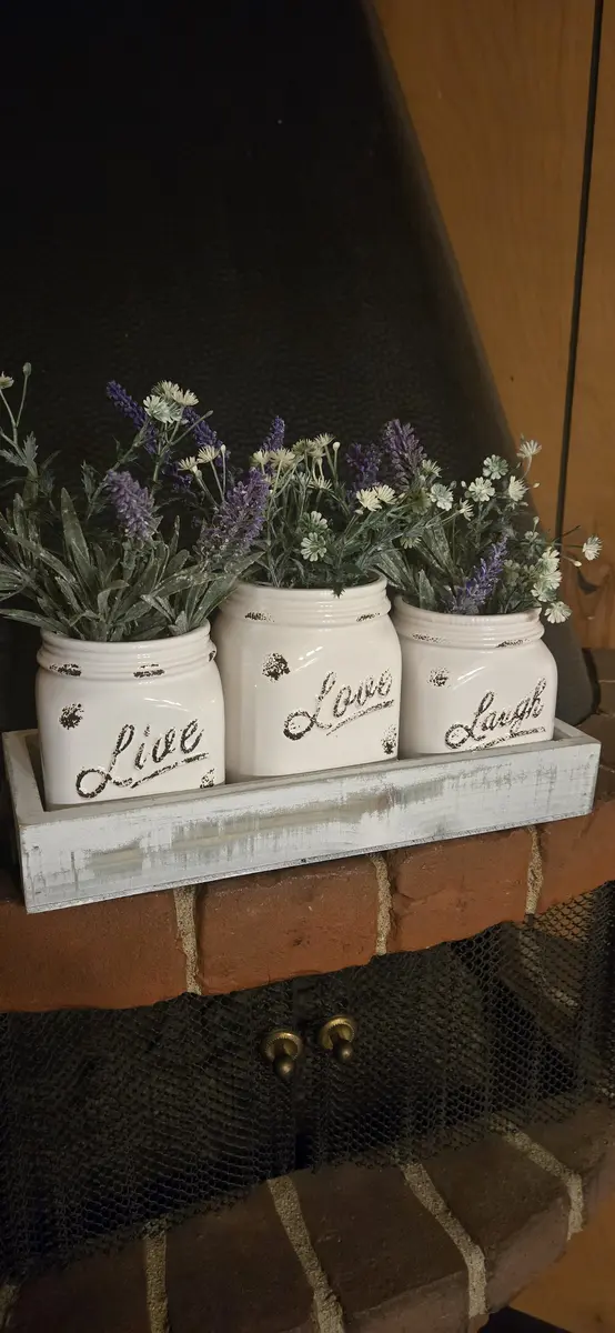 NEW Ser of 3 Mason Jars Live Laugh Love w Lavender Floral Arrangement and Wood Box