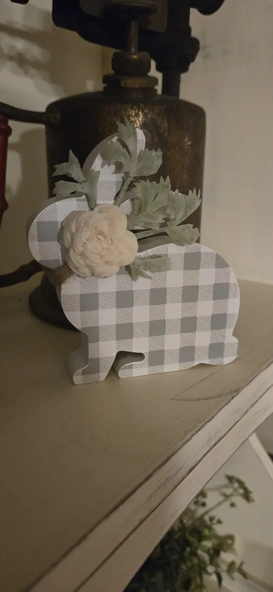 Gray White Buffalo Check Bunny Sitter w Wood Flower