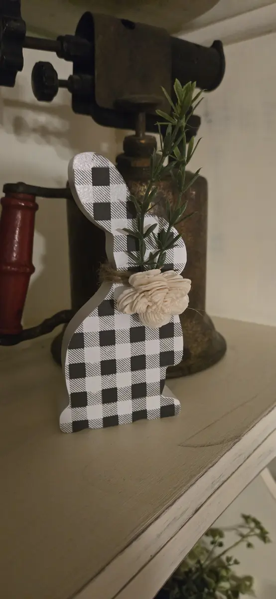 Black White Buffalo Check Bunny Sitter w Wood Flower