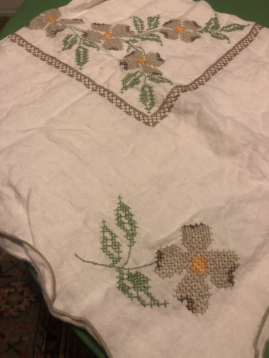 Cross Stitch Tablecloth with Tan and Sage Green Floral